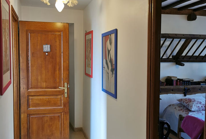 Salle de douche privative, séparée de la chambre par un couloir lui aussi privatif. Composée d’une douche, d’un wc et d’un lavabo ancien double et sèche cheveux.